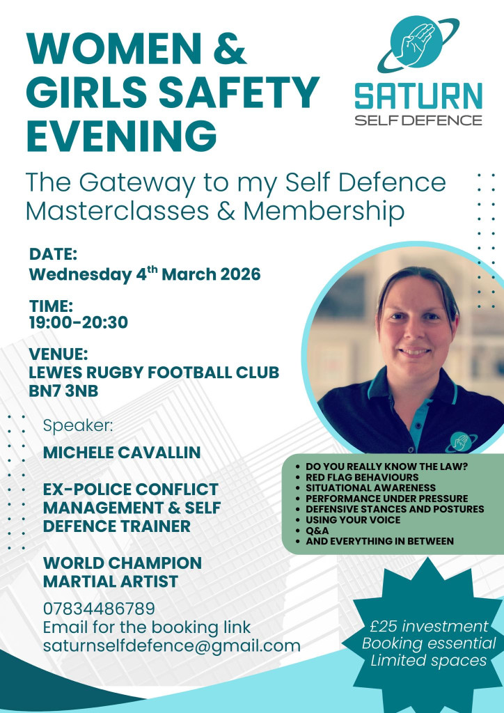 Saturn Self Defence provides realistic, scenario-based self defence training for the public in the South East of England. Our training centre is based in Lewes, but we can travel to your venue. Fronted by Michele Cavallin, the only female self defence trainer in Sussex with a Police Safety Trainer background.